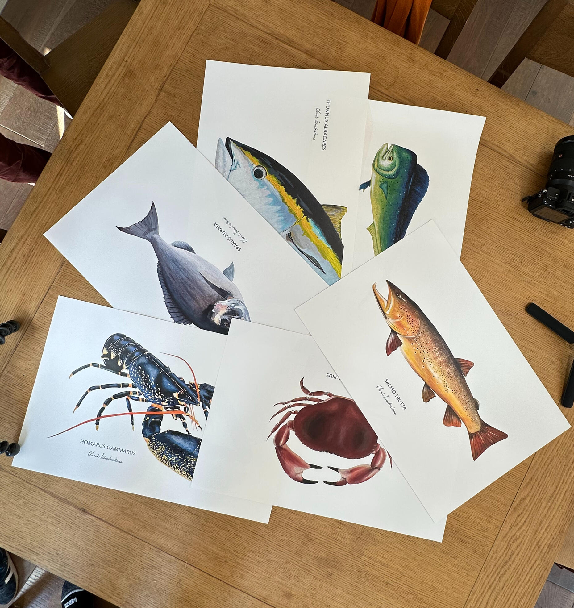 La peinture est une deuxième passion familiale. Nous peignons à l'acrylique, les poissons et crustacés croisés lors de nos parties de pêche. Ces toiles sont ensuite reproduites pour compléter une gamme de produits de décoration destinée à l'affichage mural mais aussi à l'art de la table. Illustrations, set de tables, cartes de vœux, nous déclinons nos peintures pour tous les amoureux du monde halieutique. Varek Illustrations c'est aussi:
